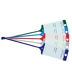 Die Vorderseite ist mit Hilfslinien versehen und die Rückseite ist unliniert. Die Beschriftungsfelder sind weiß und mit deutscher und englischer Beschriftung versehen. Die Warenanhänger sind besonders flexibel, robust, lichtecht und wetterbeständig.